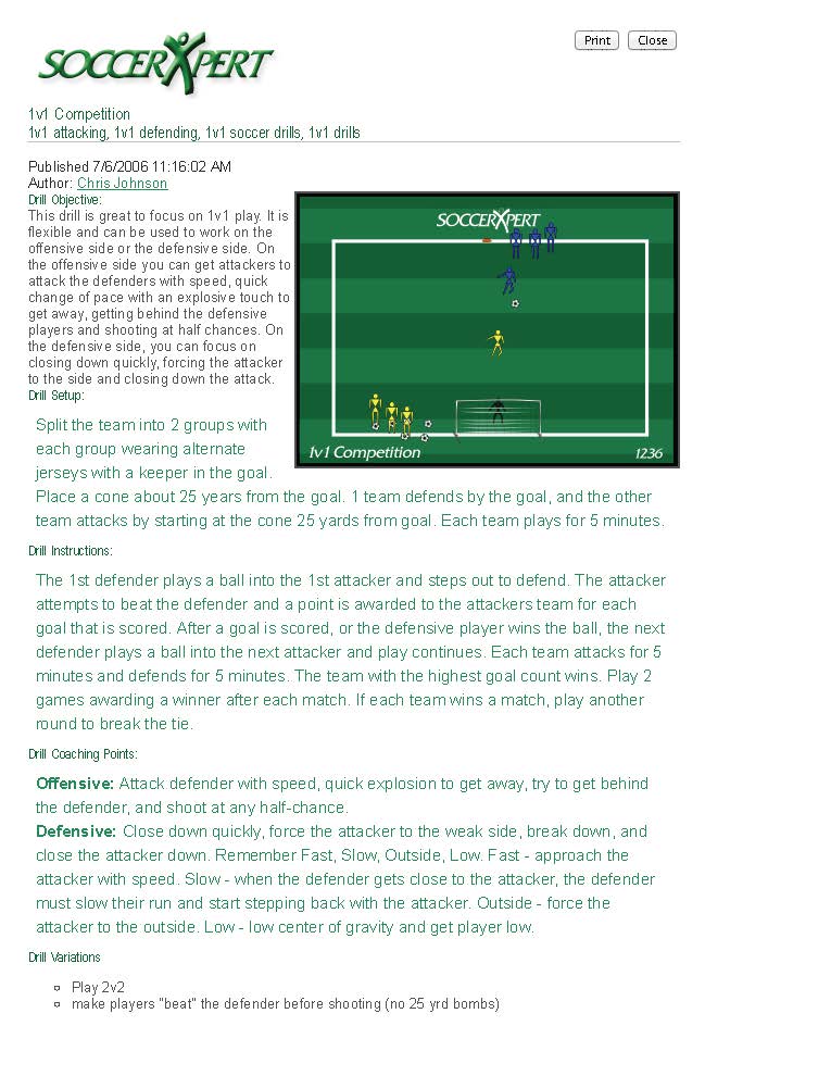 Soccer Xpert - searchable drills by age group, drill type and topic. Illustrations help make the drills clear. Sample drills included here.